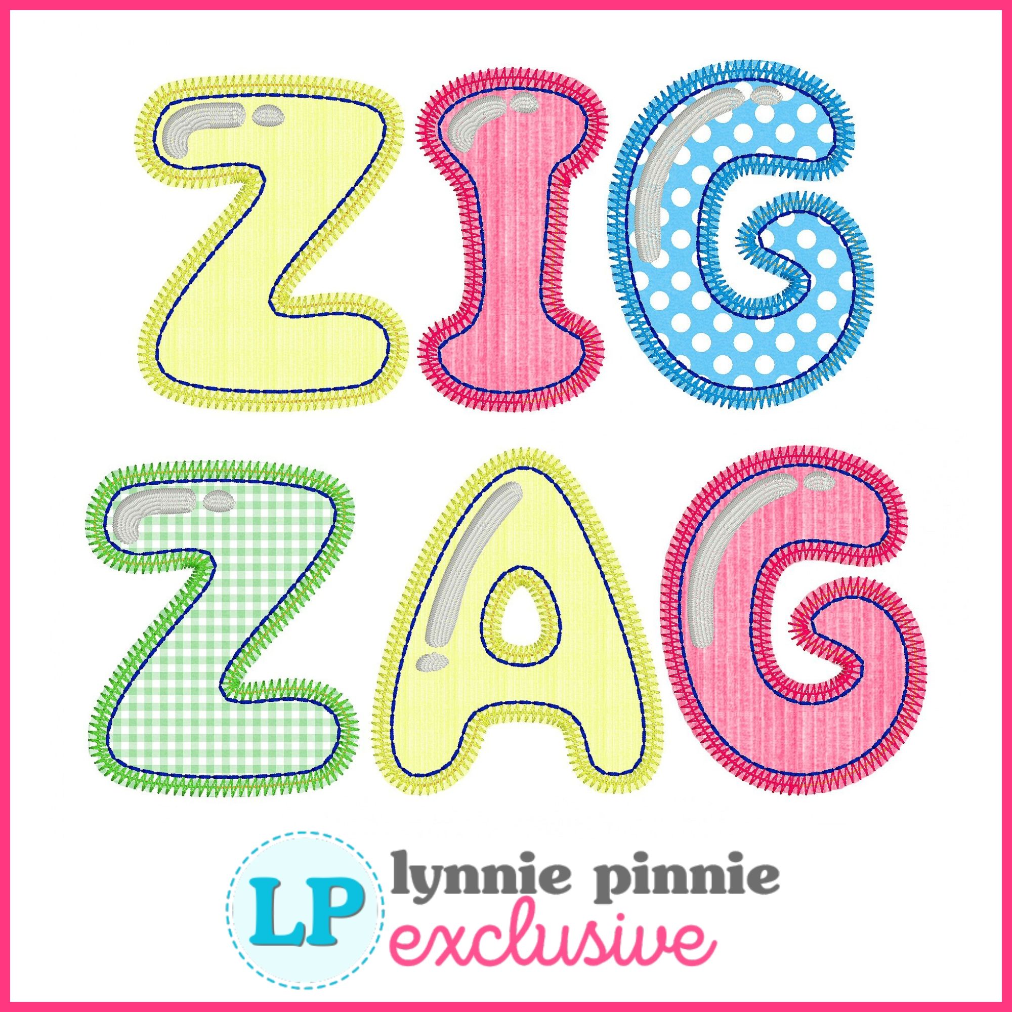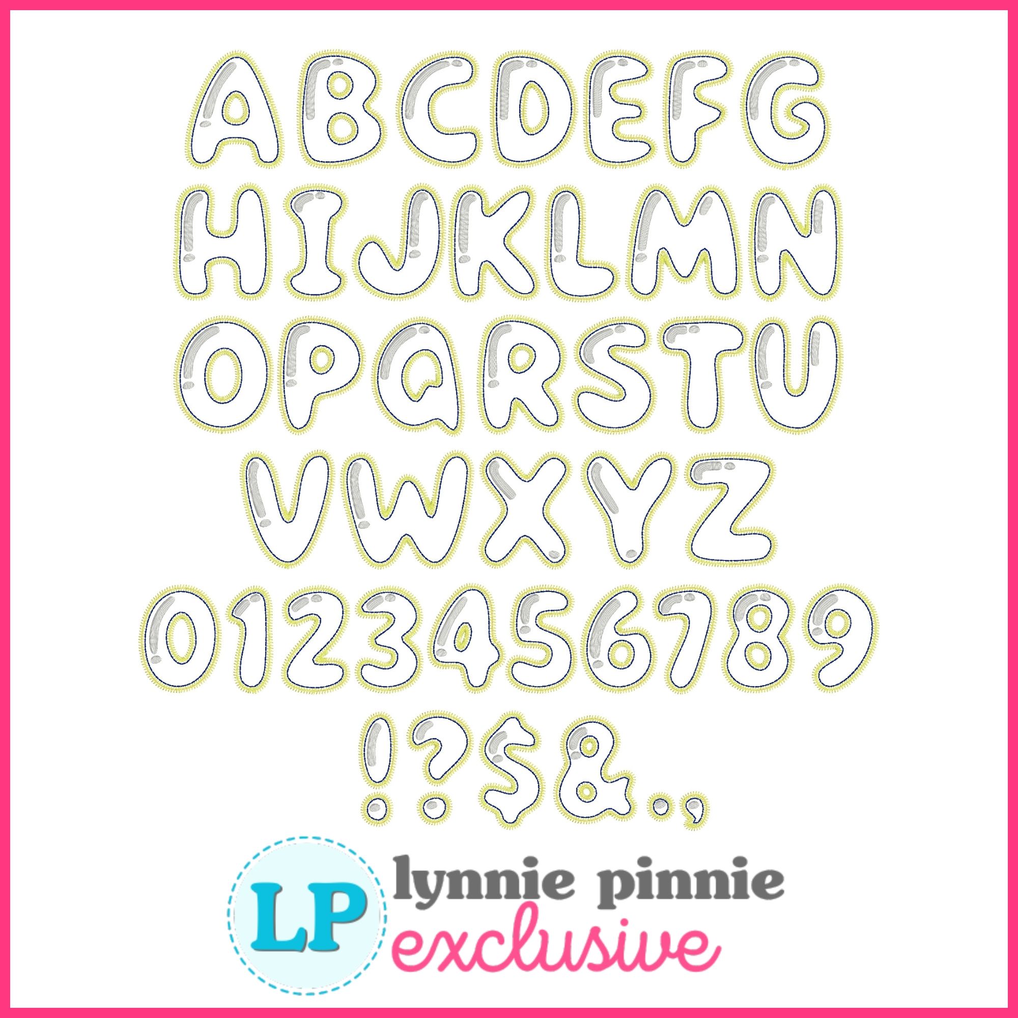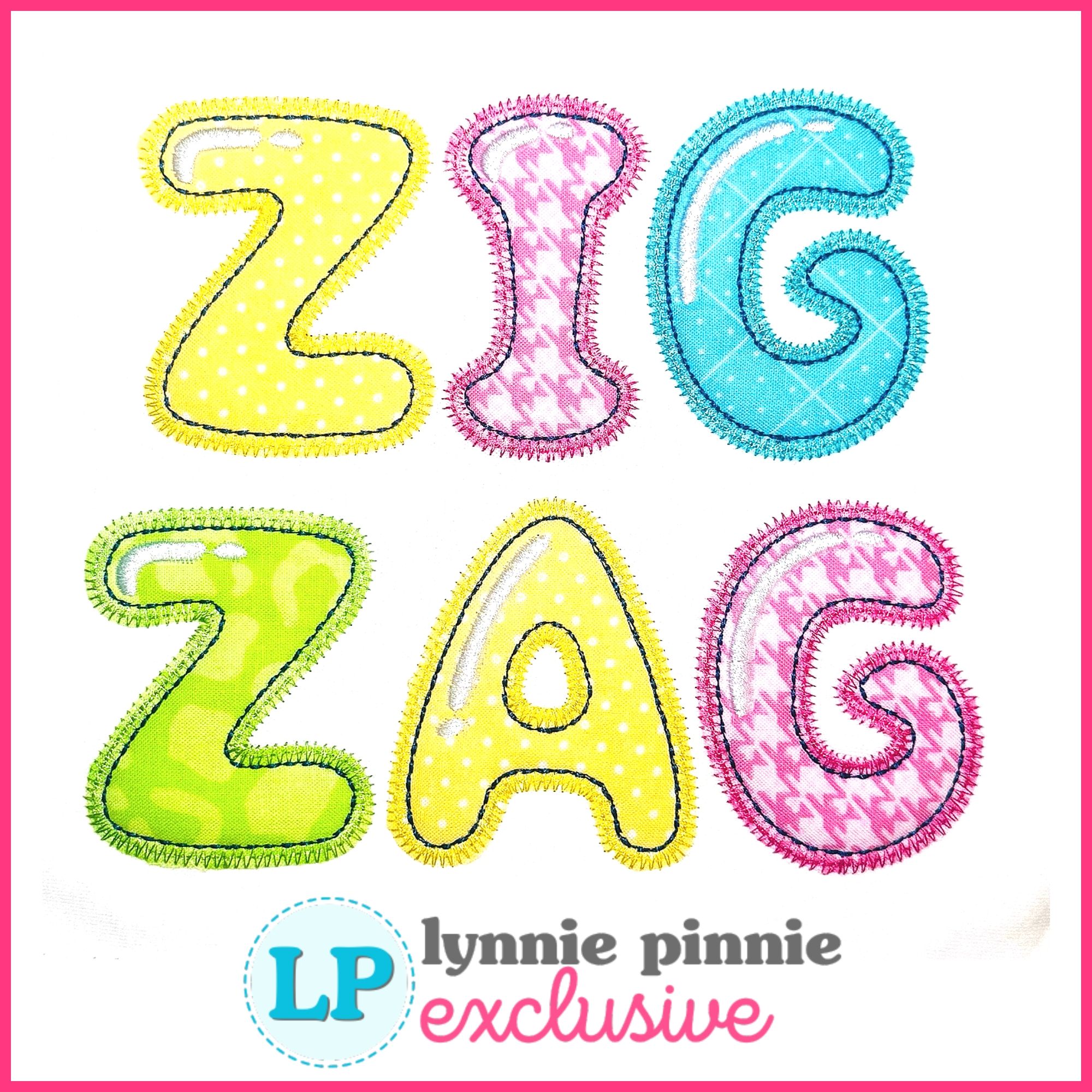 Bubble Bop Zig Zag Applique is a bold, balloon-inspired uppercase applique embroidery font featuring a quick-stitch zig zag finish, contrast outline, and reflective-style details.