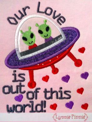 "Our love is out of this world"! This cute alien couple is flying off into the sunset. This design can be stitched like a regular applique or you can use vinyl over the spaceship's window for a unique look.