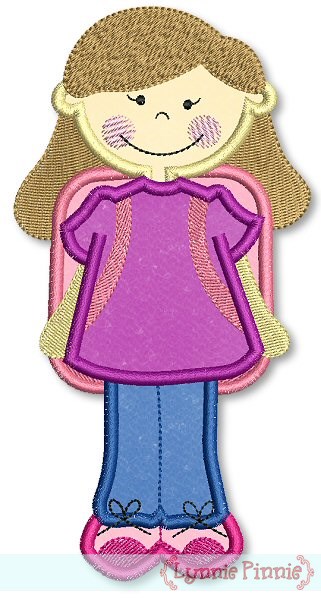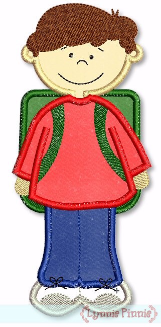 School Boy and Girl in 4x4, 5x7, and 6x10 hoop sizes, plus pencil, glue, scissors, books, and crayons each in 4x4 and 5x7 sizes.