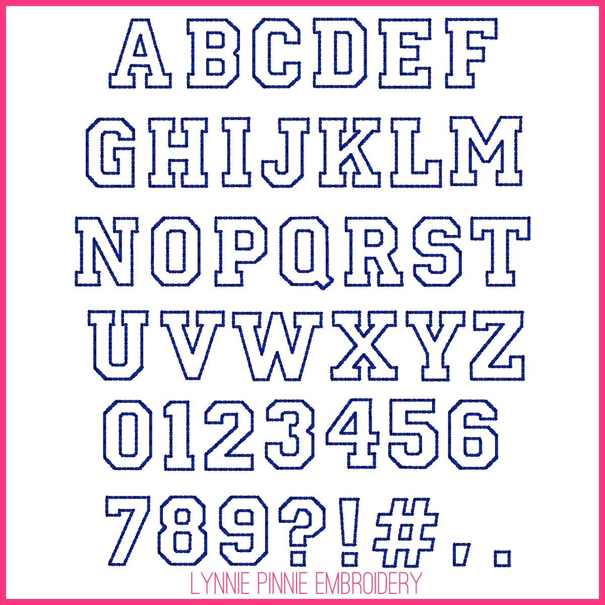 ART, DST, EXP, HUS, JEF, PES, VIP, VP3 and XXX formats include uppercase letters, numbers and punctuation in 5 sizes: