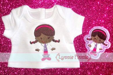 This little cutie is an adorable doctor or nurse!  This mini design is perfect for doll clothes and coordinates with our Little Cutie Doctor Girl Applique