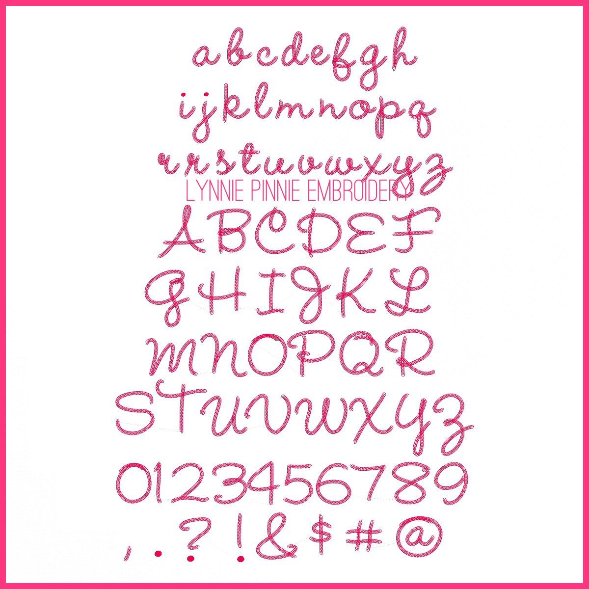 ART, DST, EXP, HUS, JEF, PES, VIP, VP3 and XXX formats include uppercase letters, lowercase letters, numbers and punctuation in 5 sizes: